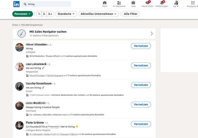 A temporary but simple solution is to use the keyword search field of LinkedIn searches with the term "hiring." This approach can produce a wide range of profiles that are dealing with the topic of recruitment or new employees in some form. It is a direct approach that can be quickly implemented and delivers initial results, even if it is not fully tailored to the specific requirements.