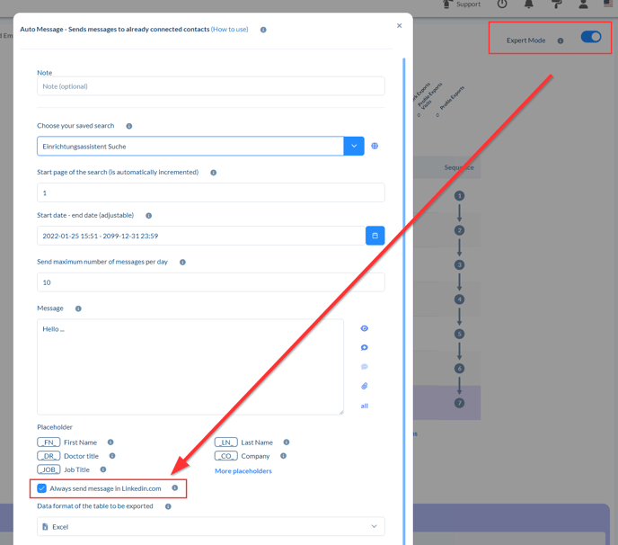 2) The option "always send message in LinkedIn.com" appears in the auto-messages/campaign messages function when you use a Sales Navigator search. To send only in Sales Navigator you need to deactivate the checkbox.