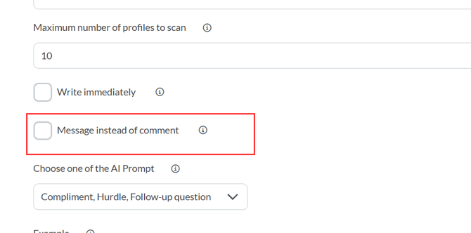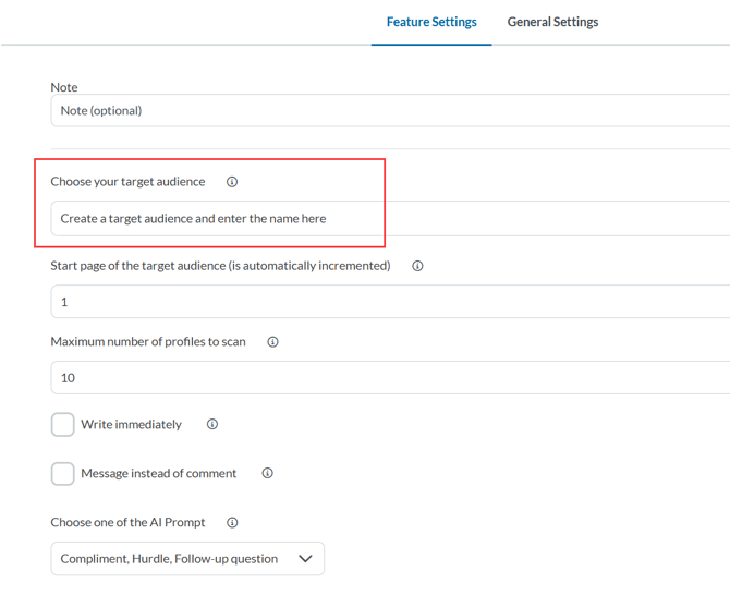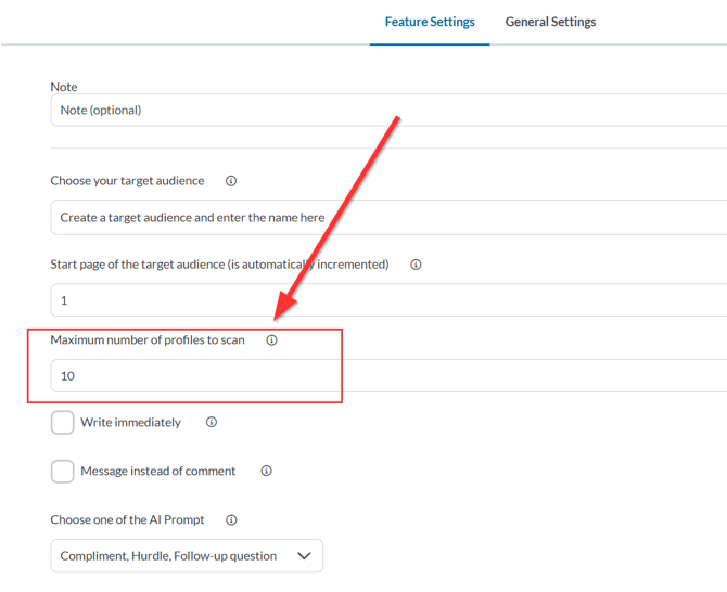 Here you determine how many profiles should be checked to see if a post exists. Not all scanned profiles will automatically receive a comment—only those with an active post.