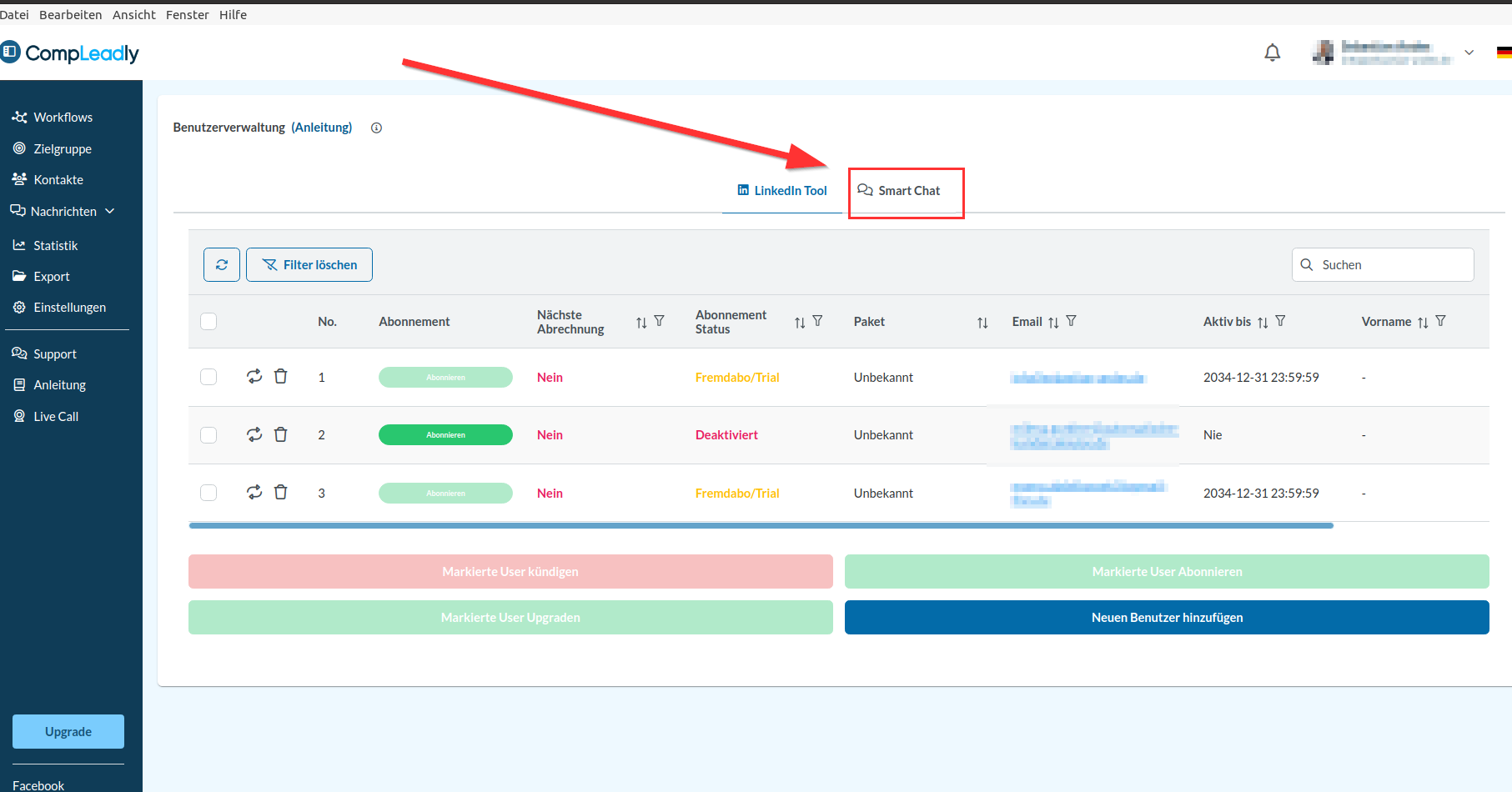 Where can I find Smart Chat in the user administration? #admin You can see the activation for Smart Chat at the top of the tab
