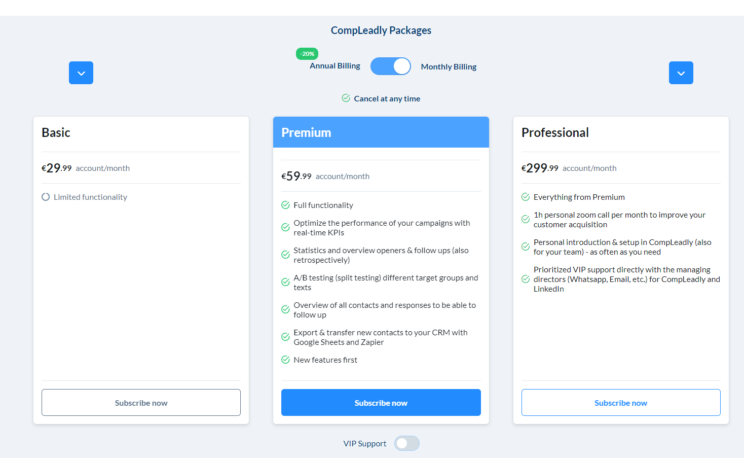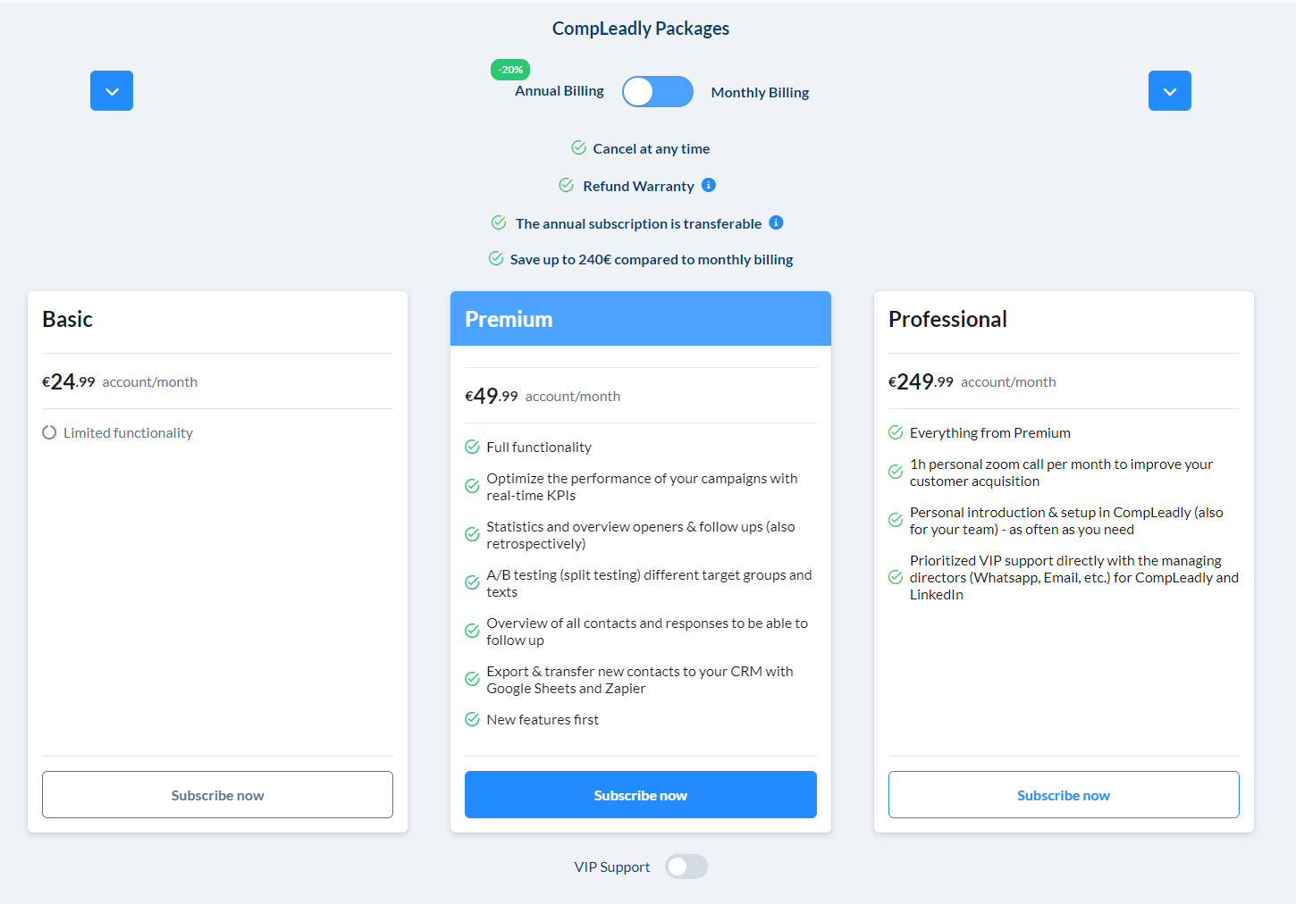On the website, the price is set to annual billing by default. You can change this here in CompLeadly.