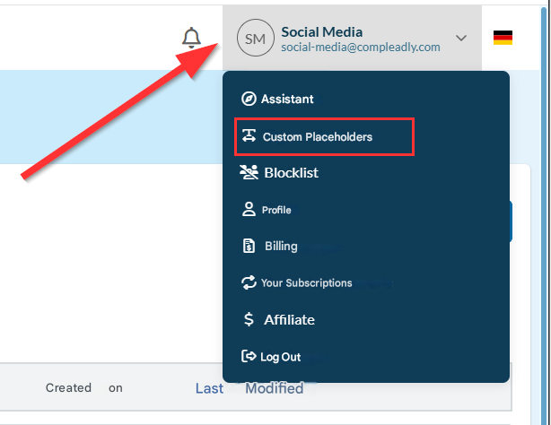 Where can I create placeholders Click on the head icon in the top right corner of CompLeadly, then click on custom placeholders.